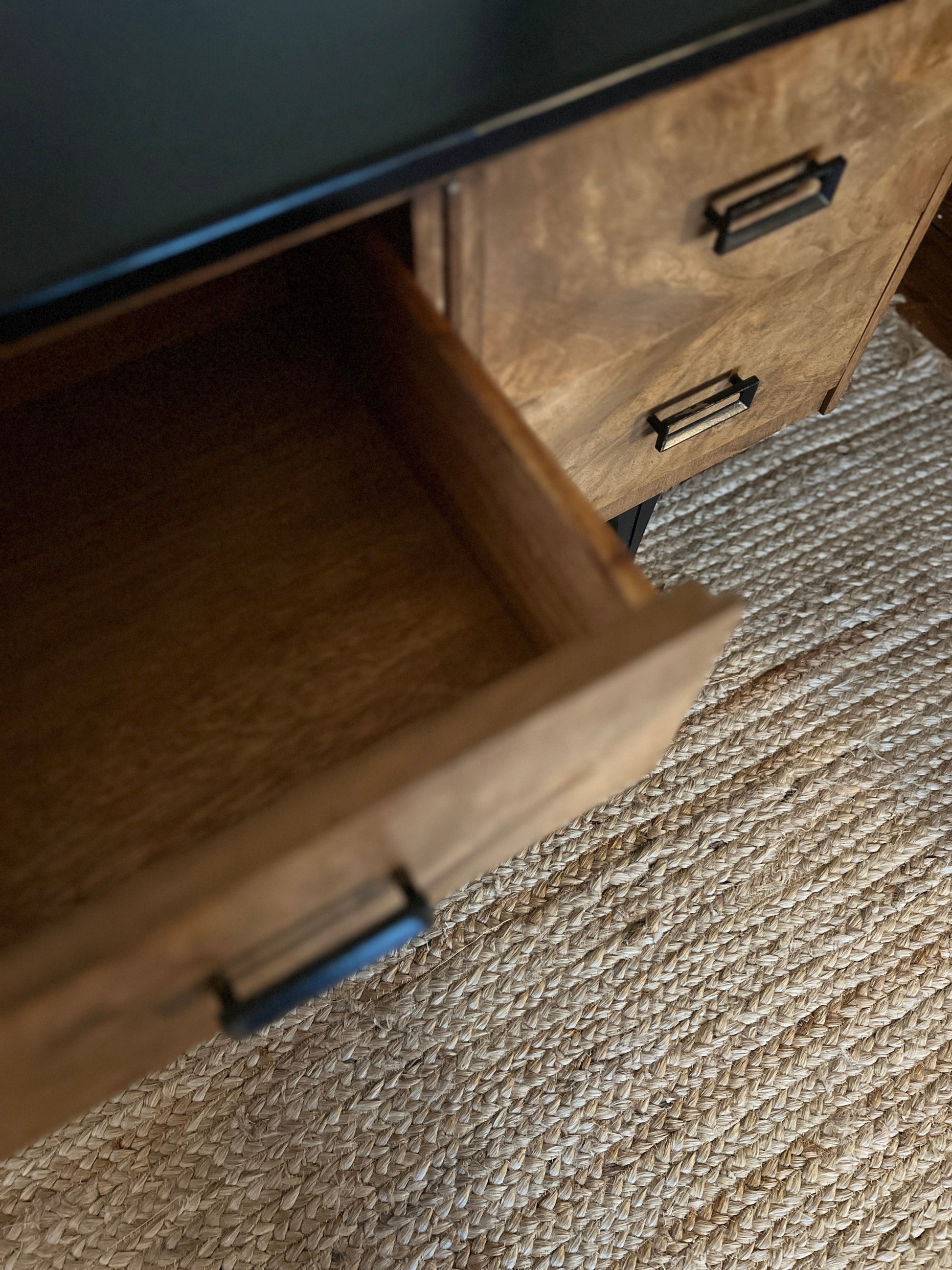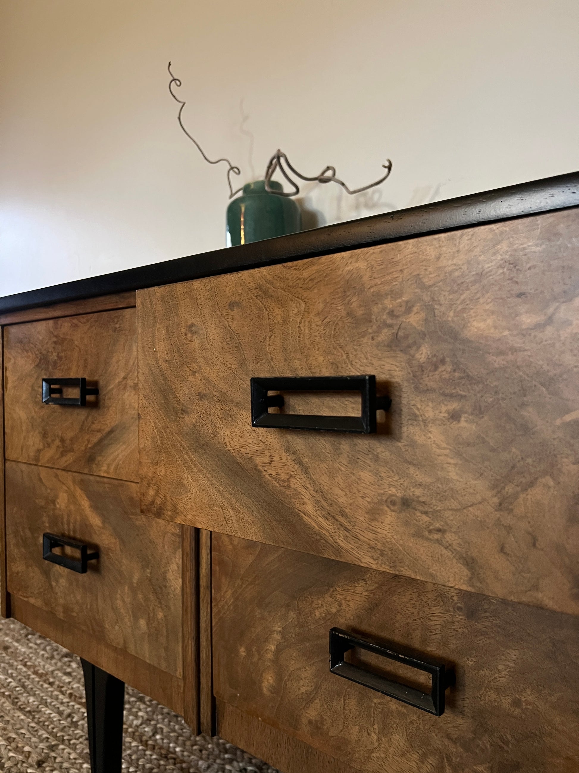 This is a fully renovated vintage burr walnut chest of drawers. The book matched walnut veneer is outstanding and complements the original black handles perfectly. The top of this chest of drawers has been professional strayed to black for a more contemporary look. He stands firmly on tapered, adjustable legs.