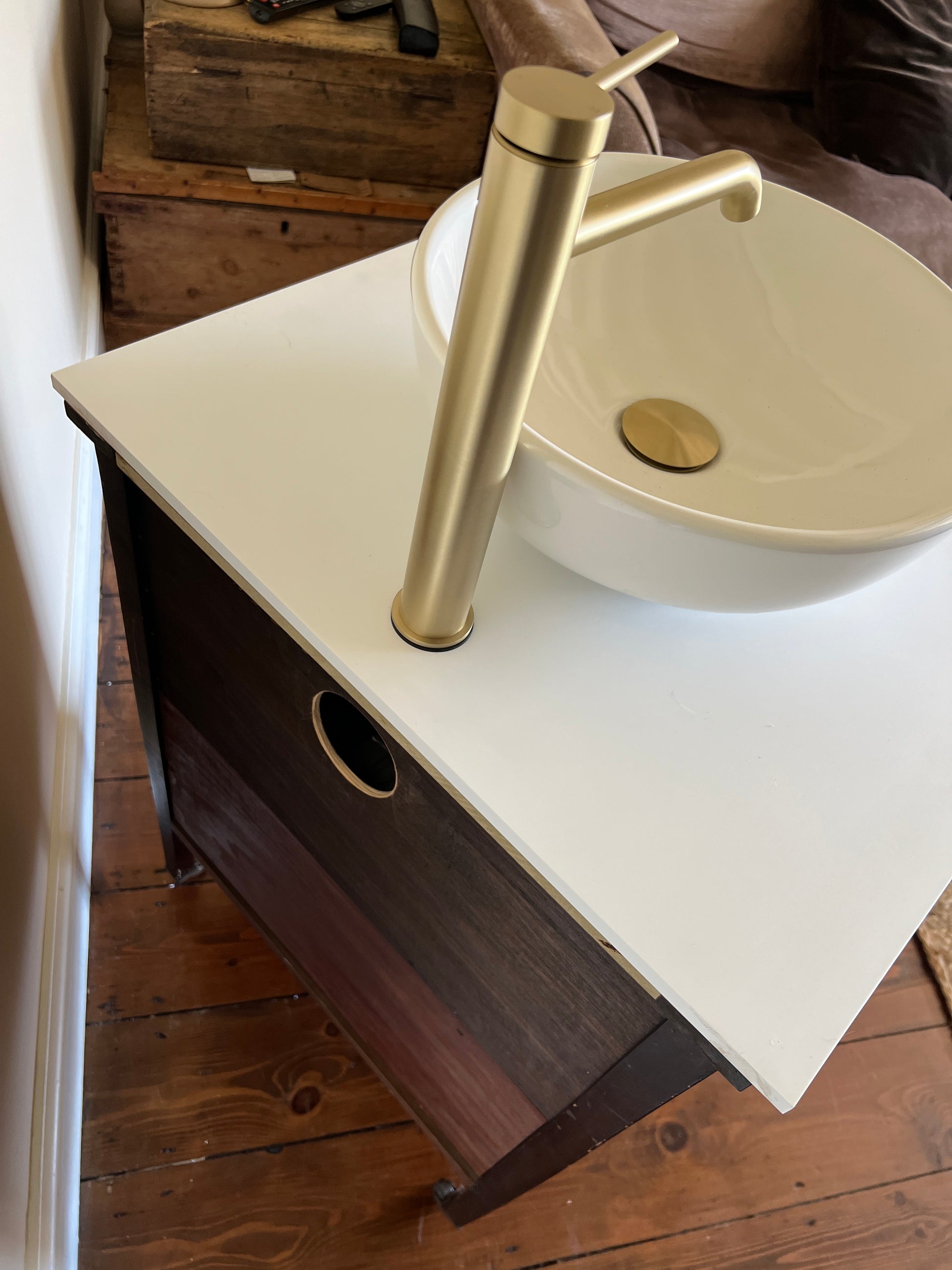 It has a round basin and a pure white corian worktop that's both sleek and durable. The brushed gold tap and trap complements the original brass gold handles.